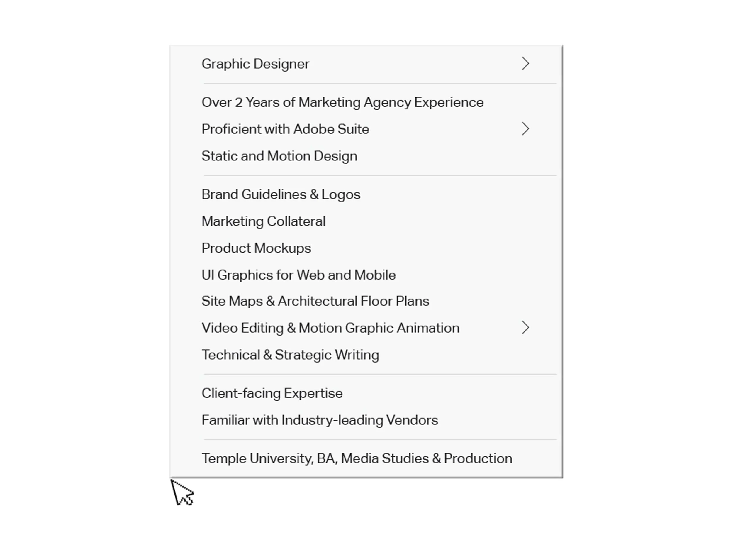 Over two years of marketing agency experience as a graphic deisgner. An eye for detail is my specialty, but creativity is my true passion.